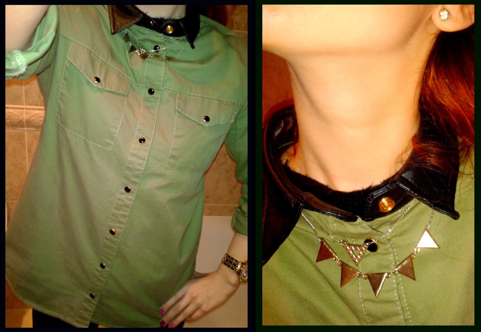 - a kdyý už jsme teda byla v té náladě rozhodla jsem se celý ouftit směřovat lehce do army stylu- košili s pevnějšího khaki plátna a koženým límečkem, jsem si původně kupovala místo džínsky, svetříku, ale dnes jsem se vzhledem k zimě rozhodla ji použit klasicky a pod ní si právě ten teplejší svetřík vzít - mám ráda teplo :)