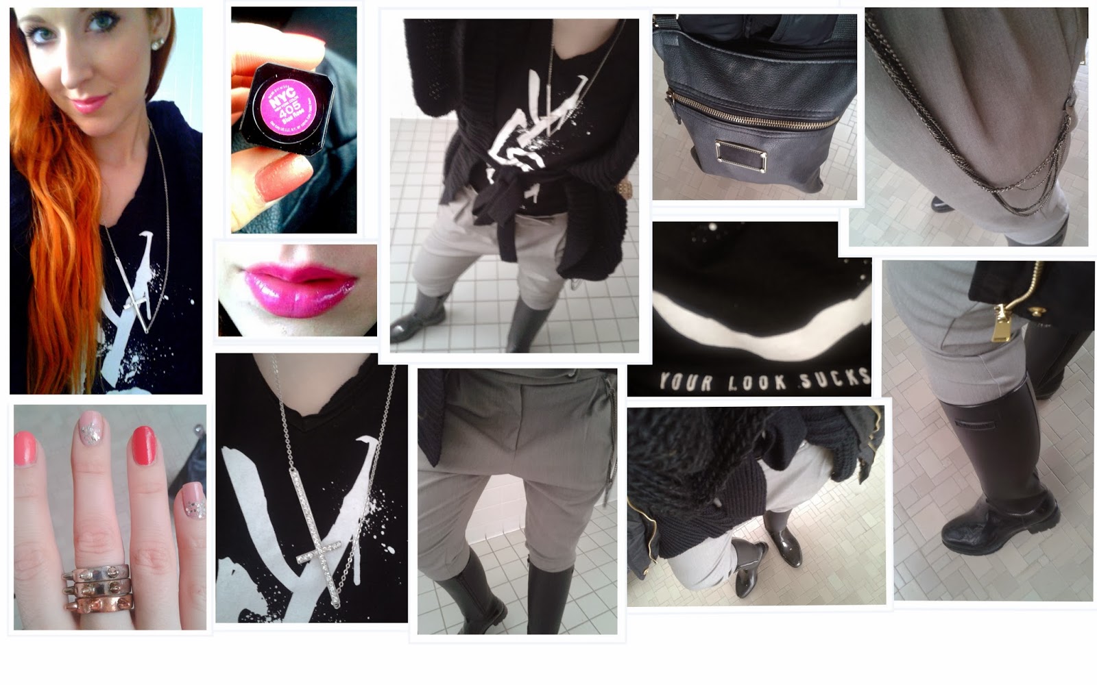 - navíc je pondělí , mám povinnosti v kanceláři, pak nějaké lítaní a odpoledne trávím s ,,fashion haters,, takže dávám klasicky přednost praktičnosti - ,,bikers boots,, a černá barva od hlavy až k patě ..... až na růžovou rtěnku, nehty a tílko :)